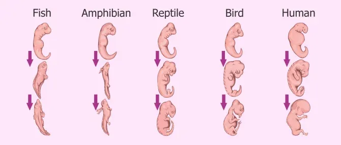尽管鱼胚胎的褶皱在很大程度上与人类胚胎的褶皱相似,但这种相似性随着它们的生长而消失。以下是人类胚胎和其他脊椎动物之间最常见的一些相似之处: